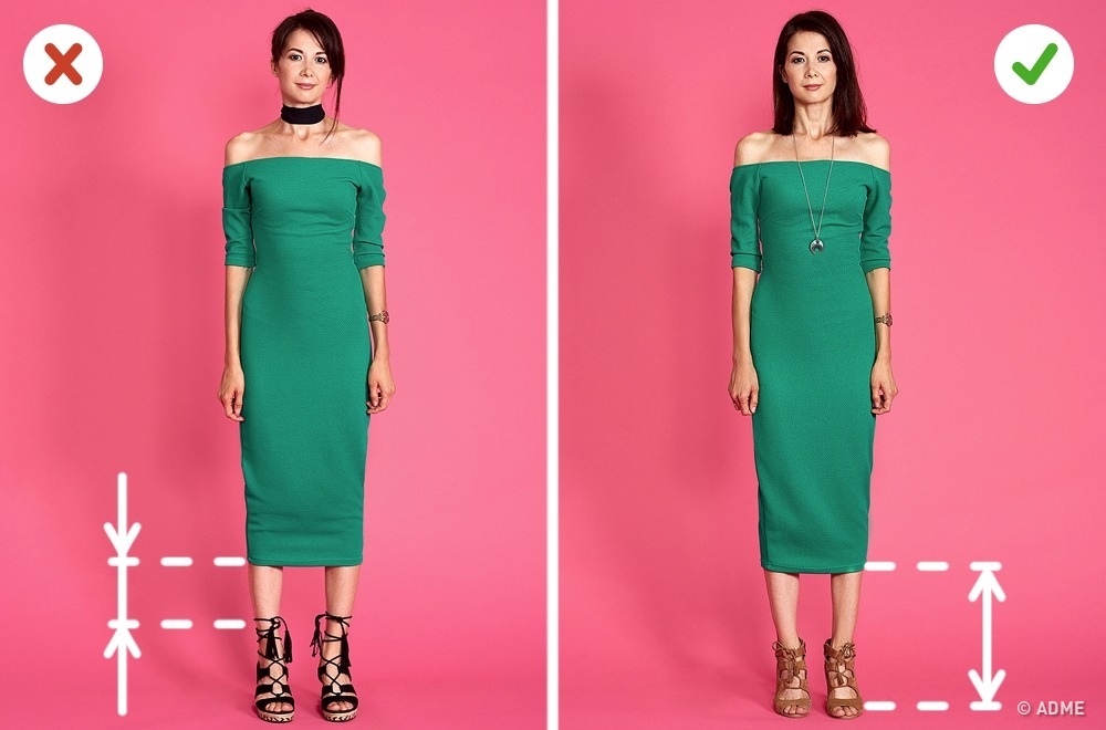 Також, як видно з нашого прикладу, краще не використовувати прикраси, які «ріжуть» образ по горизонталі. Наприклад, модний зараз чокер. Шия в нього виглядає товщі, і вся фігура здається присадкуватою.