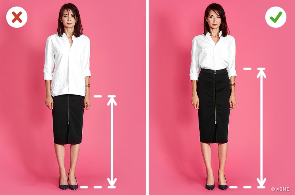 Окремої уваги заслуговує спідниця-олівець. Вона прекрасно підкреслює фігуру, а також допомагає виглядати вище. Якщо у вас немає короткого топа, то вас виручить біла сорочка — це must have на всі часи. У нашому випадку її обов'язково потрібно заправити всередину: так ви будете виглядати помітно стрункішою.