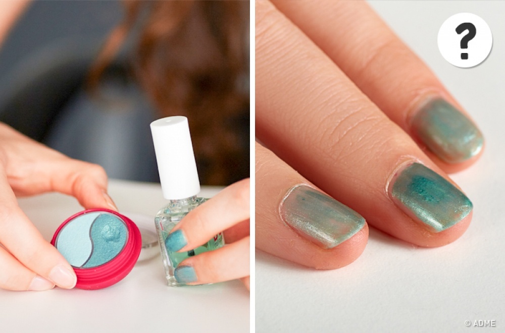 Ми подрібнили тіні і змішали з краплею безбарвного лаку. Проблема в тому, що це все складно добре перемішати, поки лак не застиг. Це створило великі проблеми з нанесенням, лак ліг дуже нерівно. Ми взяли дешеві перламутрові тіні, тому колір вийшов а-ля моя перша вчителька Маріванна. Якщо брати тіні більш глибоких кольорів, може вийти щось цікаве. Думаю, заслуговує право на життя, якщо добре розмішати тіні прямо в бульбашці з лаком.