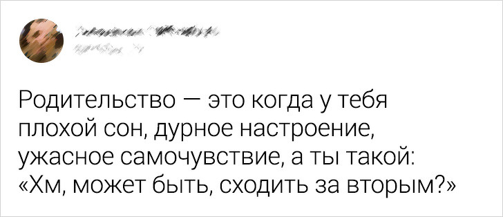 Вчора сиджу у стоматолога, входить лікар з сусіднього кабінету і від сміху аж плаче. Розповідає, що свердлить зуб мужику, а той закриває рот і починає хропіти. Виявляється, просто заснув. Ну мужик і розповів, як дійшов до такого життя. Було в них два сини. Ну дуже хотіли доньку — зважилися і народили двійнят, хлопчаків. Тепер у нього 4 сина, 2 роботи і тіло миттєво «засинає», якщо приймає горизонтальне положення, і йому пофіг, що з ним роблять: скачуть на ньому або його топчуть, і звук бормашини не такий вже противний. Доктор пломбу йому все-таки поставив, правда, пацієнт вже сидів. © olmol97 / Pikabu