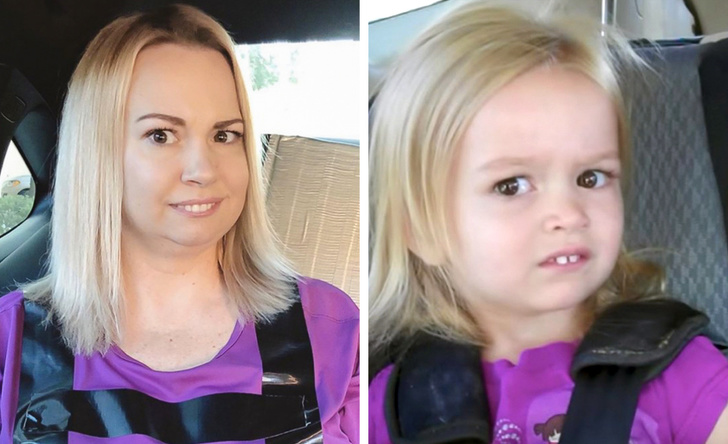 Бонус: дівчинка Хлоя (праворуч) завдяки цьому кадру з дуже здивованим виразом обличчя стала героїнею численних мемов в інтернеті. Її мама Лілі (ліворуч) повторила образ дочки, і відразу стало зрозуміло, у кого Хлоя така забавна
