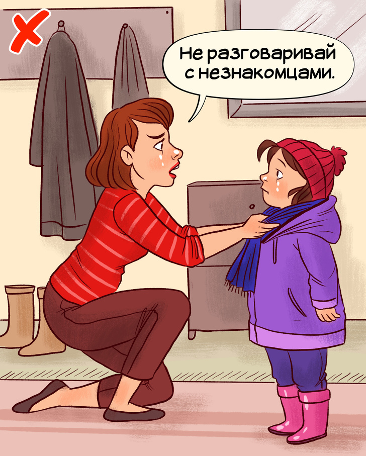 У випадку з маленькими дітьми ця концепція занадто складна для розуміння. До того ж, вони можуть почати цуратися всіх незнайомців, у тому числі тих, хто намагається їм допомогти, наприклад поліцейських або пожежних. Замість того, щоб забороняти дитині спілкуватися з будь-якими перехожими, краще поясніть, як треба поводитися в конкретних ситуаціях, наприклад, якщо який-небудь підозрілий чоловік запропонує їм цукерки і покличе до себе додому.