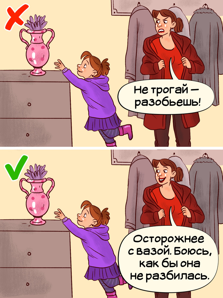 Якщо ви будете постійно повторювати подібного роду фрази, це призведе до того, що дитина стане скутим і невпевненим у собі. Після таких слів малюк і правда, найімовірніше, упустить або поламає річ, адже ви заздалегідь налаштували його на такий результат. У дорослому житті, ця людина може боятися будувати кар'єру — він буде впевнений, що у нього нічого не вийде, а значить, і починати не варто. Якщо ви боїтеся, що дитина може зламати або пошкодити якусь цінну річ, краще скажіть: «Будь обережніше з цим. Я переживаю, як би воно не розбилося».