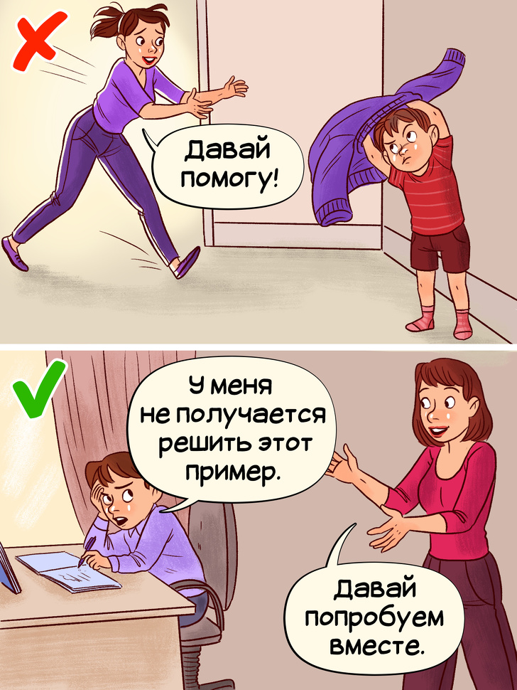 Вміння дитини визначати, коли йому дійсно потрібна стороння допомога, а коли він може впоратися самостійно, — один з найважливіших навичок, які ми повинні придбати в ранньому віці. Багато батьків випереджають потреби своїх дітей, наприклад, допомагаючи їм з домашнім завданням, яке вони цілком могли б зробити самі. У дорослому житті такі люди потім насилу беруться за нову для них роботу, побоюючись невдач.