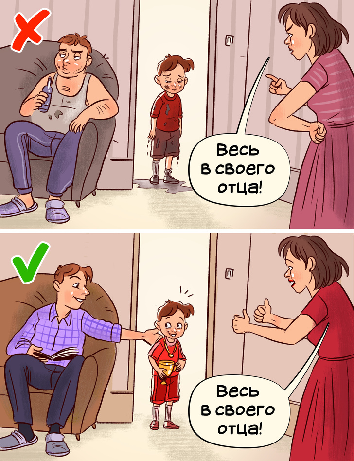Немає нічого поганого в тому, щоб порівнювати дітей з ким-небудь з його рідних в позитивному ключі. Але найчастіше подібні фрази носять негативний характер. Причому критиці піддається поведінка не тільки дитини, але і батьків. Це збиває дітей з пантелику і змушує обирати бік мами чи тата, прагнути догодити комусь одному з них.