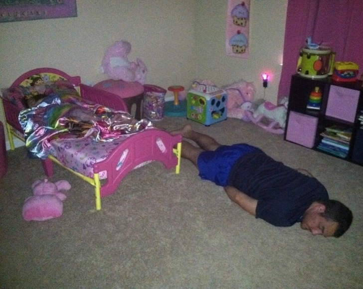 2. Ця дівчинка не хотіла спати одна, але її ліжечко дуже крихітна для тата