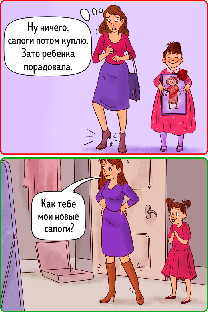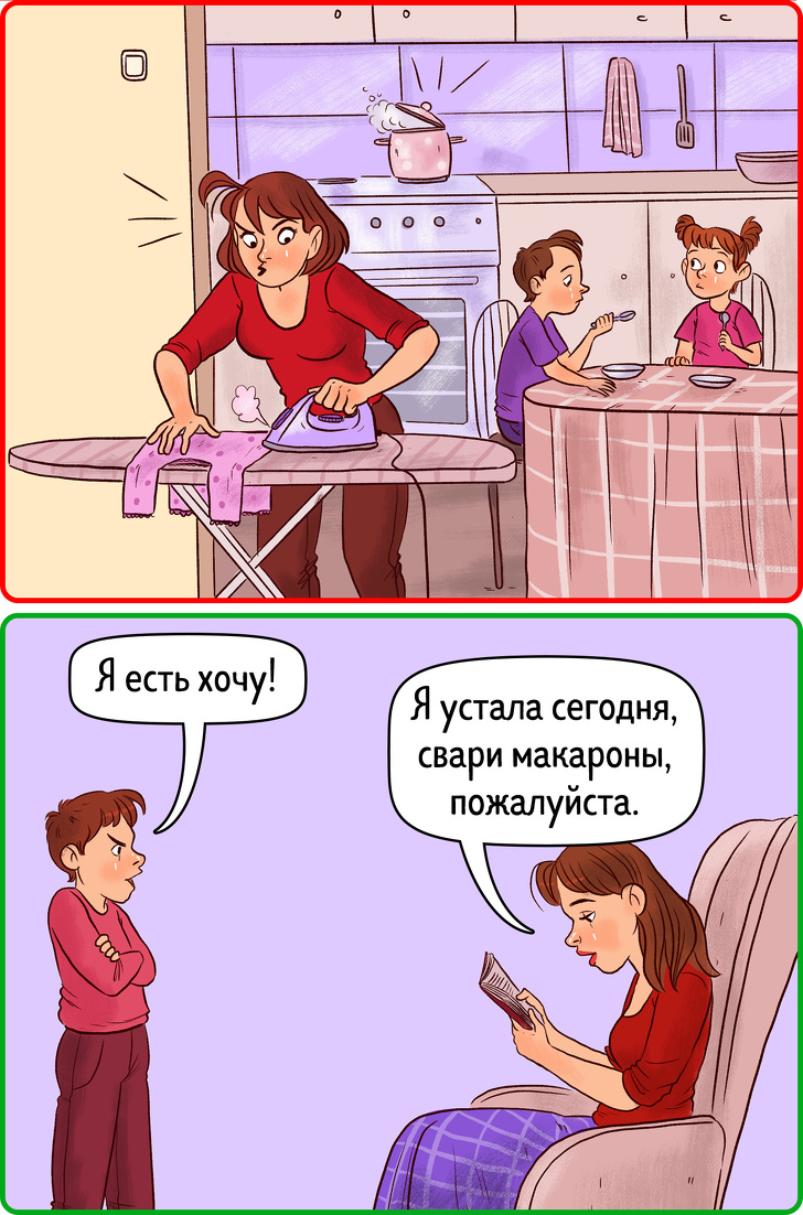 Не порівнюйте себе з инстамамами, перегляньте власні очікування і вимоги до себе. У чому їх можна пом'якшити? Що можна делегувати, а чого не можна робити взагалі? Може, вистачить однієї прибирання раз в 2 тижні, а замість того, щоб готувати самій, ви іноді будете замовляти їжу з доставкою додому? Або попросіть сусідку-пенсіонерку за невелику плату відводити доньку на танці? Можливо, пора забити на дрібниці на зразок плями на шкільній формі або неглаженой сорочки.