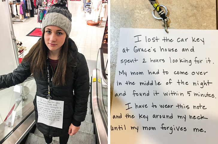 «Я загубила ключі від машини вдома у подруги і витратила 2 години на їх пошуки. Мамі довелося приїхати посеред ночі, щоб забрати мене, і вона знайшла їх за 5 хвилин. Я буду носити цю записку і ключі на шиї, поки мама не пробачить мене».