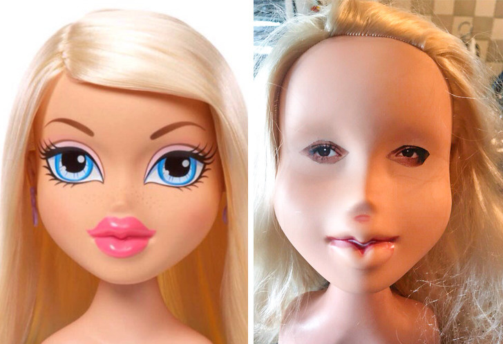 12. Папа намагався почистити ляльку дочки уайт-спіритом і випадково змив їй весь макіяж. Щоб хоч якось виправити ситуацію, він приклеїв їй очі, які вирізав з журналу