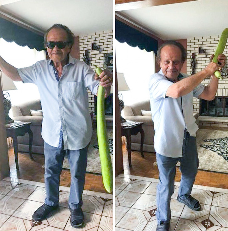10. «Мій дідусь попросив показати „людям з інтернету“ кабачок, який він виростив сам. Друга фотка — візуалізація того, що він зробить з тими, хто скаже, що його кабачок потворний»