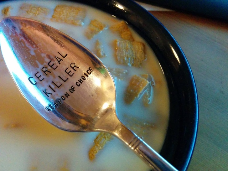 Напис на ложці — гра слів: сereal killer — «вбивця вівсянки». Cereal звучить так само, як serial. Serial killer, в свою чергу, перекладається як «серійний вбивця». Weapon of choice — «улюблене зброю».