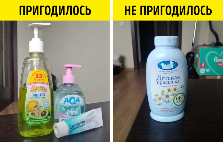 Нам залишалося лише придбати дитячу косметику. Гарне дитяче мило з дозатором обходилося в ₽ 120 за пляшечку. З урахуванням того, що це мило купувалося на всю сім'ю, в тому числі і на дорослих, які постійно мили руки перед тим, як торкатися до дитини, таких пляшок на місяць нам потрібно було 3 штуки. Дитячий крем з пантенолом обходився приблизно в ₽ 500 — тюбика вистачало на 2 місяці. Присипка виявилася не потрібна.