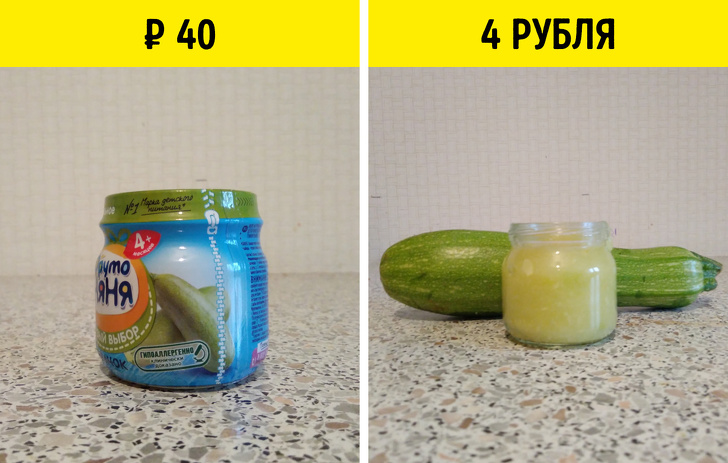 Зростання витрат відчувся відразу, тому їжу для дитини ми вирішили почати готувати самостійно. Якраз в самому розпалі був сезон кабачків, на місцевих ринках вони коштували по ₽ 30-35 за 1 кг. З 1 кг кабачків виходить приблизно 8 баночок пюре. До цього часу дитина з'їдала вже за 2 баночки овочів у день. Собівартість 1 баночки кабачкового пюре, зробленого своїми руками, становила близько ₽ 4.