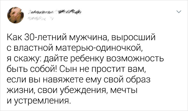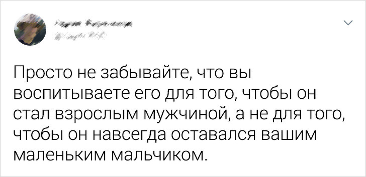 - Мама повинна бути залученою в життя сина, але не владною. Найбільш пригніченими й напруженими хлопцями з моїх знайомих завжди були ті, чиї мами контролювали їх кожен крок. © lotsoflukey