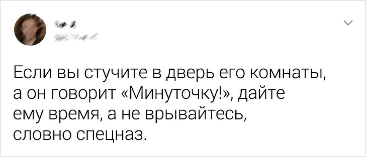 - Не розповідайте те, що поділився з вами син наодинці, комусь ще. Моя мама весь час розповідала всі мої секрети своїм братам і сестрам, рідним та двоюрідним, друзям, а потім говорила мені: «Ну це ж ті люди, яким я довіряю!» Що ж, я засвоїв цей урок і з часів старшої школи не розповідаю мамі нічого особистого. Вона регулярно скаржиться на мою скритність, але вибач, мамо, у мене на це є вагома причина. © forgottt3n