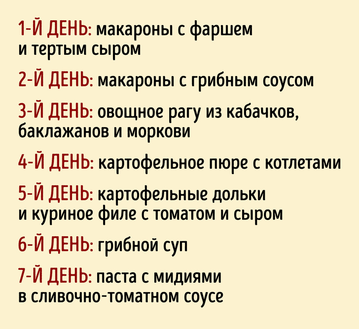 «Їсти, щоб жити» — це не про мене. Їжа — це задоволення, як і перегляд улюбленого фільму, задушевна бесіда з одним або подорож. Тому, плануючи меню на тиждень, я поставила мету: кожен день годувати домочадців новим блюдом. При цьому те, що було на вечерю в понеділок, залишається на обід у вівторок. І так 7 днів.