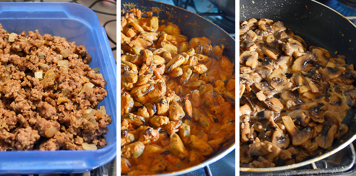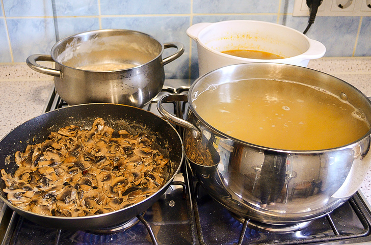 «Розподіляючи» страви по дням тижня, намагалася сформувати оптимальне співвідношення м'яса, овочів і мучного. При готуванні задіяла 4 конфорки відразу. Спочатку зварила з каструлі макарони і вівсянку — цього гарніру вистачить на 5 днів. Паралельно варила грибний суп і соус. Підготовка продуктів зайняла півгодини, приготування — 1 година 30 хвилин.
