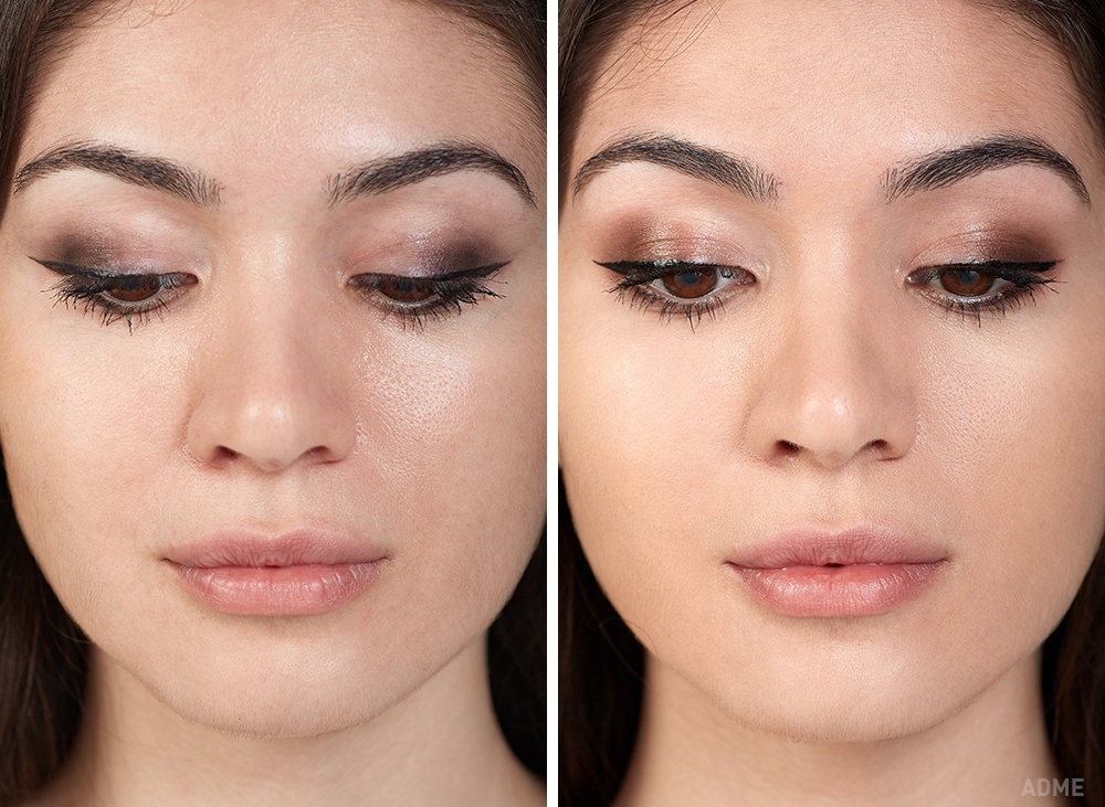 Дешева косметика (зліва): Тональна основа наноситься крем, текстура дуже нещільна, не вирівнює шкіру і до того ж стягує її. Пудра наноситься теж неоднорідне і робить шкіру на обличчі помаранчевої, незважаючи на те, що обрано вірний тон.