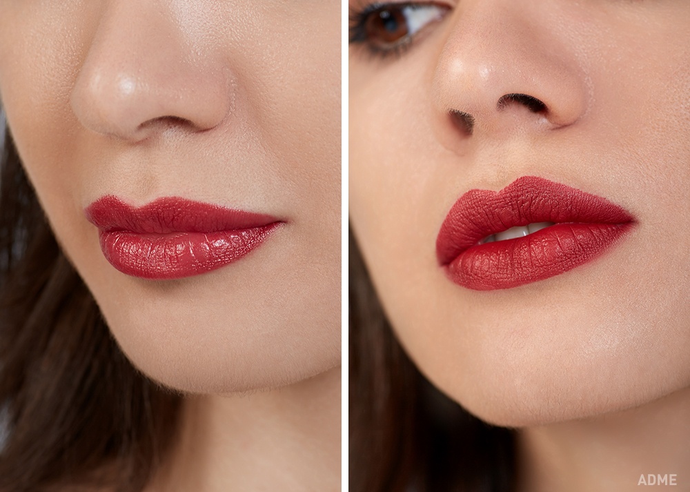 Дорога косметика (праворуч): Матова, з приємним запахом. Трохи складно наносити із-за того, що вона досить щільна і суха.
