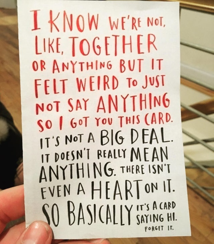 «Я знаю, що ми не те щоб разом або щось в такому дусі, але було б дивно взагалі нічого не сказати, тому що я приготував цю листівку. Нічого особливого. Насправді це нічого не значить. Тут навіть сердечка немає. Так що, по суті, це просто вітальна листівка. Забудь».