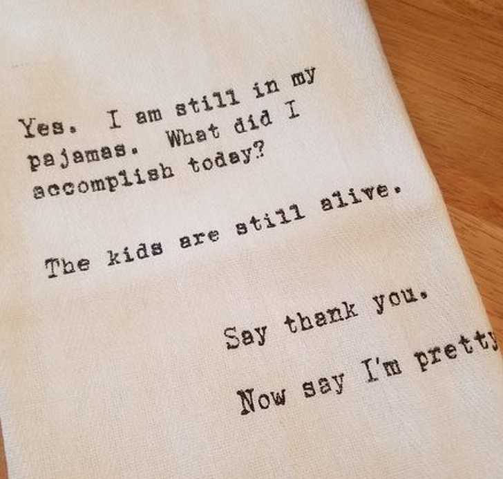 «Так. Я все ще в піжамі. Що я за сьогодні зробила? Діти все ще живі. Скажи спасибі. Тепер скажи, що я гарна».