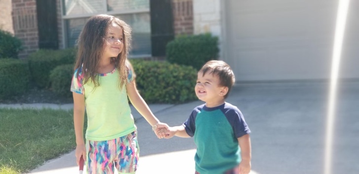 «Моя дочка нічого не бачить з кінця 2017 року. Я зробив це фото на телефон, коли вони з братом стояли, не штовхаючись. Здається, що вона дивиться на нього і посміхається. Це одночасно радує мене і б'є прямо в серце, тому що здається, що вона бачить його»