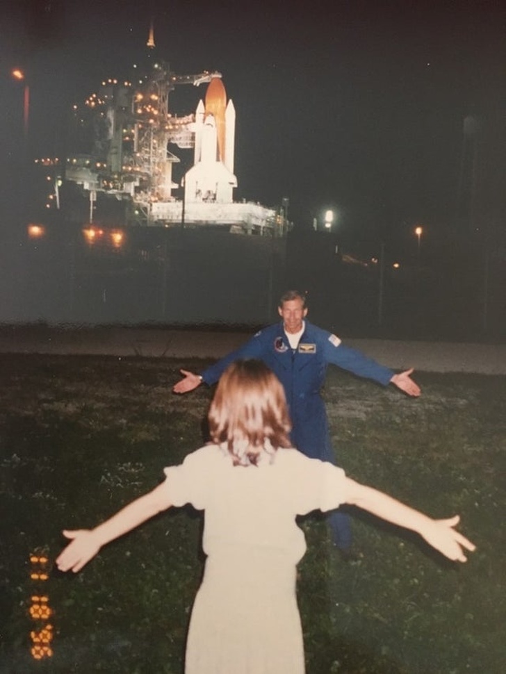 «Перед запуском шаттла „Колумбія“ мені дозволили „обійняти“ тата на прощання. На фото не видно стіни, яка відділяє космонавтів від їх родин, тому що перед польотом у космос діє система карантину»