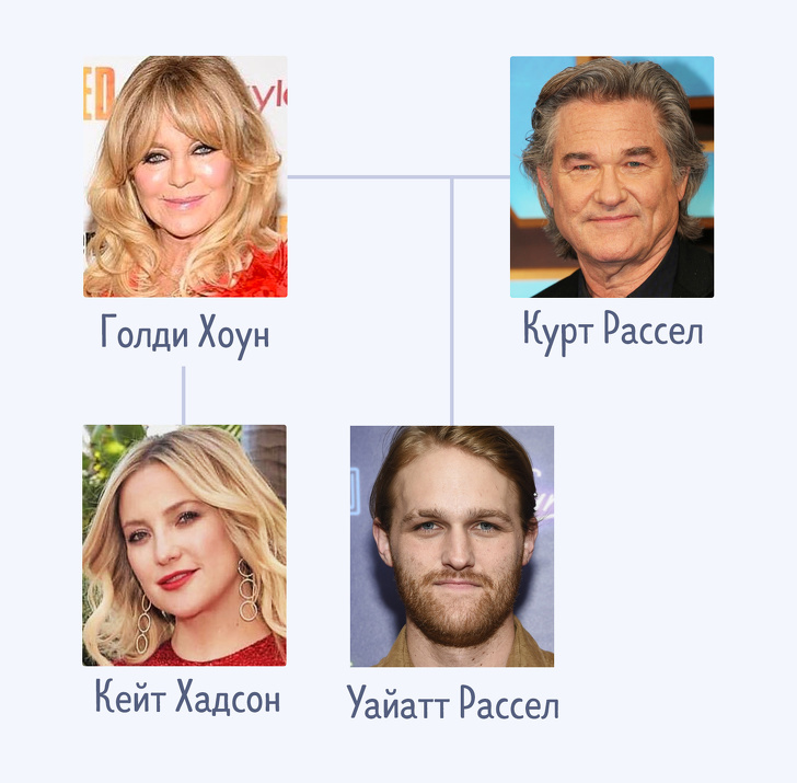 Усміхнена Голді Хоун — володарка «Оскара» за роль у фільмі «Квітка кактуса» (1969 рік). Вже 35 років вона щаслива в парі з відомим актором Куртом Расселом. Їх син Уайатт починав кар'єру хокеїста, але незабаром гени взяли своє, тепер хлопець щосили штурмує Голлівуд. Він знявся в комедіях «Мачо і ботан — 2», «Кожному своє», а також у серіалі «Чорне дзеркало». А дочка Голді від першого шлюбу — Кейт Хадсон — вже знайшла світову популярність.