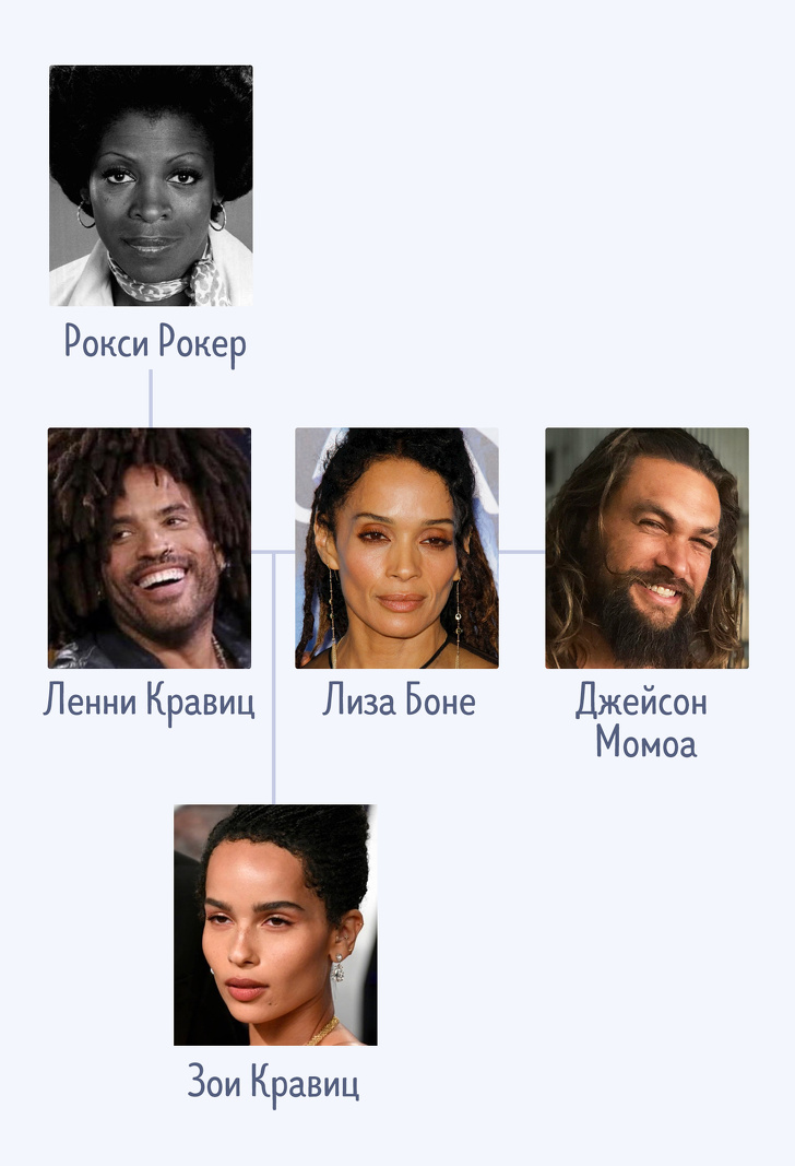 Роксі Рокер була успішною театральній і кіноактрисою. Але її син Ленні Кравіц затьмарив мати, ставши відомим музикантом. Ленні знявся всього в одному фільмі «Голодні ігри», а ось його колишня дружина Ліза Боні у 80-90-ті була вельми затребуваною актрисою. Однак їх дочка Зої Кравіц обійшла обох батьків і стала справжньою голлівудською дівою: вона блищала в «Фантастичні створіння» і в останньому «Людині-павуку». До речі, Ліза Боні зараз заміжня за мегапопулярним Джейсона Момоа. Пара виховує двох дітей. Цікаво, яку професію вони оберуть?