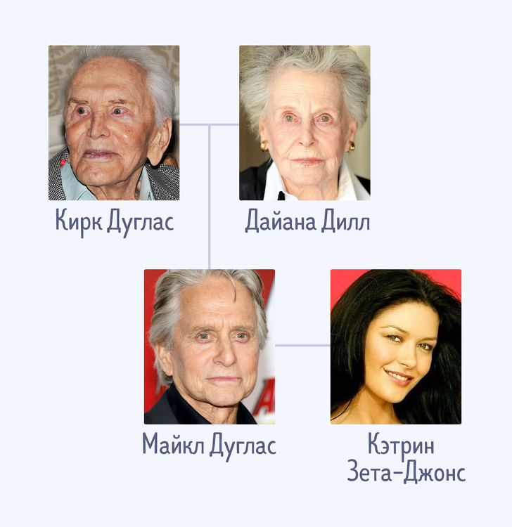 Останній представник золотої ери Голлівуду Кірк Дуглас є засновником справді талановитої династії. У 1943 році він отримав поранення в госпіталі одружився на актрисі Дайані Ділл. У цьому шлюбі народився знаменитий Майкл Дуглас, якому вдалося затьмарити успіх батька. Взявши в дружини Кетрін Зета-Джонс, Майкл лише зміцнив позиції сім'ї. І ми зовсім не здивуємося, якщо їх підростаючі діти через кілька років будуть блищати в голлівудських блокбастерах.