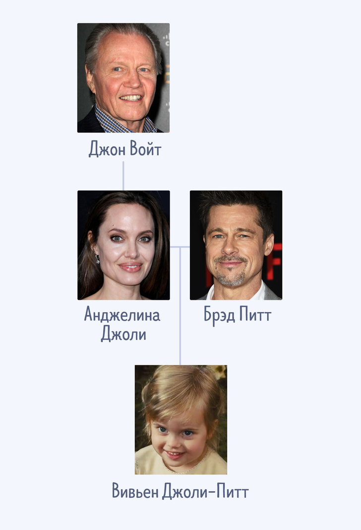 Анджеліна Джолі стала настільки популярною, що затьмарила свого батька, оскароносного актора Джона Войта. А шлюб Джолі з Бредом Піттом ще більше підігріла інтерес громадськості. І ми зовсім не здивуємося, якщо діти талановитої пари продовжать їх шлях. Так, Вів'єн Джолі-Пітт в 5-річному віці вже знялася зі знаменитою мамою «Малефисенте».