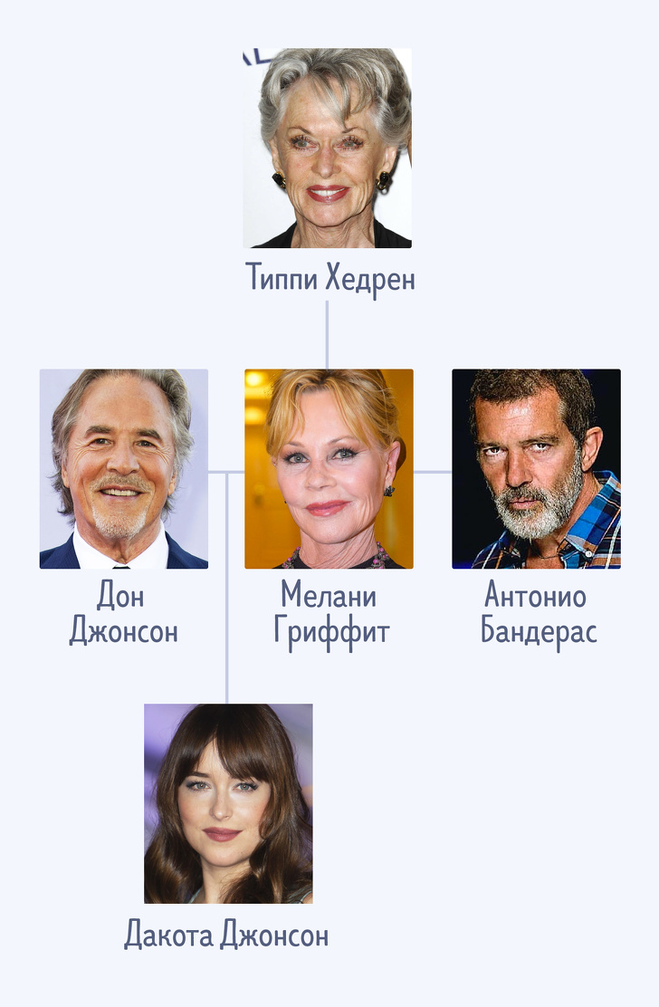 Тіппі Хедрен здобула популярність після зйомок у фільмі «Птахи» (1963 р.). У 1957 році у неї народилася дочка Мелані Гріффіт. Дівчинці судилося стати актрисою: свою першу роль вона отримала в 9 місяців. Згодом Мелані двічі виходила заміж за актора Дона Джонсона і двічі розлучалася з ним. У шлюбі народилася дочка Дакота, але виховував її знаменитий Антоніо Бандерас, за якого Мелані вийшла заміж в 1996 році. Не дивно, що Дакота вирішила стати актрисою і тепер відома всьому світу як Анастейша зі скандального фільму «50 відтінків сірого».