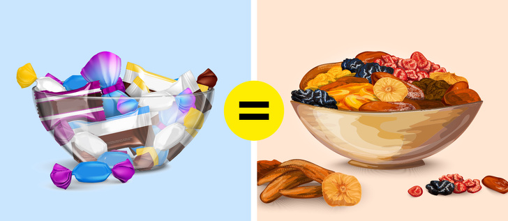 Солодощі можуть бути шкідливими, і корисними — у вас завжди є вибір. Чорнослив, курага, родзинки та інші сухофрукти — чудова природна і здорова альтернатива цукерок.
