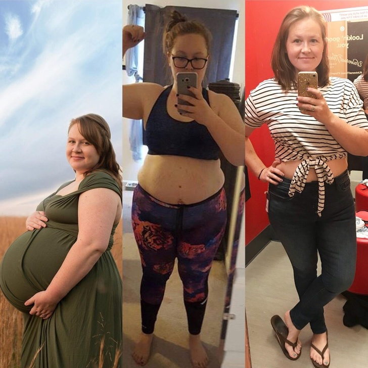 «У мене і до вагітності був зайву вагу, а потім я завагітніла двійнею — і їжа не давала мені спокою. На середньому фото — рік після пологів (грудень 2017-го), а зараз я роблю певні кроки до того, щоб носити короткий топ!»