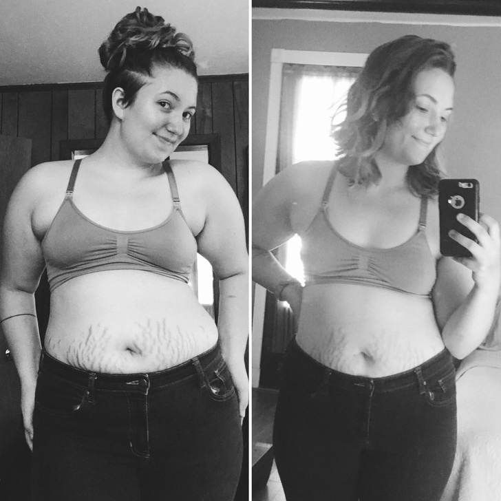 «Між цими фотографіями різниця в 5 місяців. Я боролася з післяпологовий депресією, тому мені знадобилося добрих 4 місяці, щоб почати роботу над собою».