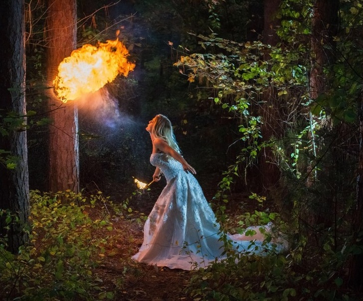 20. «Моя подруга — артистка фаєр-шоу. Вона попросила зробити її фото у весільній сукні»