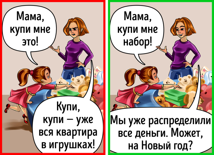Починайте з згоди: дітям важливо знати, що їх розуміють і враховують їх потреби. Поясніть, що в цьому місяці витрати вже розписані і його побажання, на жаль, не внесли. Спробуйте допомогти дитині знайти варіанти, щоб втілити в життя його мрію: попросити це в подарунок на Новий рік; відкладати; знайти схожу річ, але дешевше; продати що-те, чим не користуєшся. Йому повинно бути зрозуміло, чому предмет можна придбати зараз і яка є альтернатива.