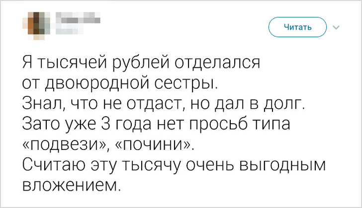 - Якщо близькі люди просять вас позичити невелику суму, не позичайте, а даруєте. Коли ви ставитеся до невеликого боргу як до подарунку, то і очікувань ніяких не буде. Немає очікувань, немає зіпсованих відносин і, відповідно, проблем. Ну а якщо гроші все ж таки повернуться, це буде приємним бонусом.