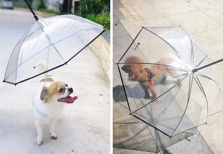 З парасолькою для собак тепер можна не пропускати прогулянки, навіть якщо за вікном дощ. Цей аксесуар підійде невеликим тваринам, які люблять неспішні прогулянки: тростинка не дуже довга і від господаря далеко втекти не вийде.