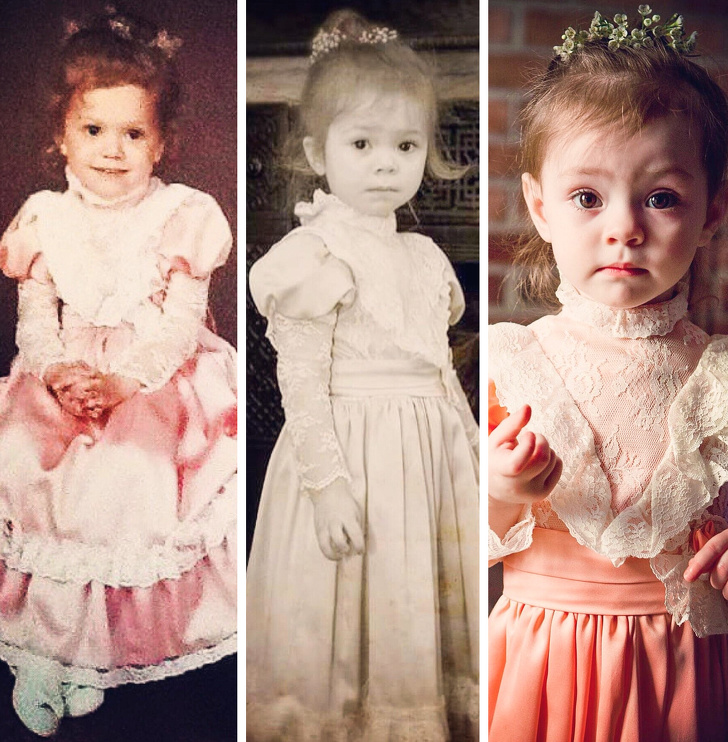 8. На першій фотографії — мама в 3 рочки, на наступних двох — її дочки цього ж сукню, кожної на фото теж за 3 роки