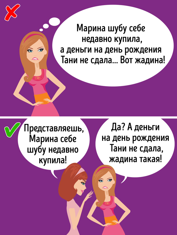 Сплетничающие люди не ставлять метою нашкодити предмета розмови, а просто прагнуть доставити собі задоволення. А поділившись інформацією з іншою людиною, ми ще і знімаємо стрес.