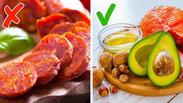 Необхідно знижувати споживання насичених жирів. Саме такі містяться в нездорової їжі, а також у більшості видів м'яса і молочних продуктах звичайної жирності.