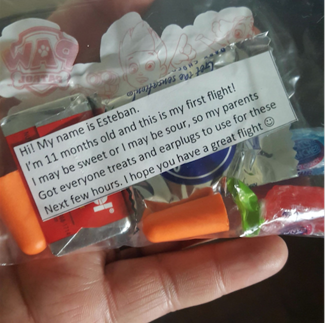 «Привіт! Мене звуть Естебан. Мені 11 місяців, і це мій перший політ! Я можу добре себе вести, а можу й вередувати, тому мої батьки підготували для всіх вкусняшки і беруші. Гарного польоту!»