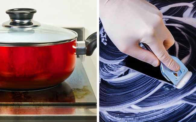 - Рідини, що містять цукор, не повинні потрапляти на гарячу поверхню плити, оскільки її нерівномірне охолодження призводить до появи тріщин. Подібні субстанції необхідно прибирати скребком відразу ж, поки ті не встигли охолонути.