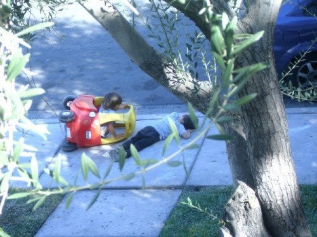 Якісь діти за вікном грають в автомобільну аварію