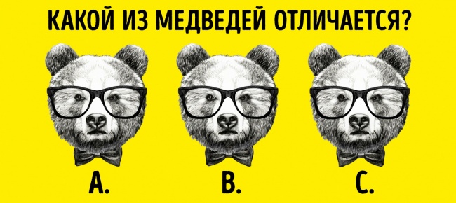 Ми склали для вас один з варіантів подібної задачі. Спробуйте знайти на картинці ведмедя, що відрізняється від інших. Засічіть час, щоб дізнатися, як швидко вам вдалося впоратися із завданням (відповідь ми дамо в кінці статті).