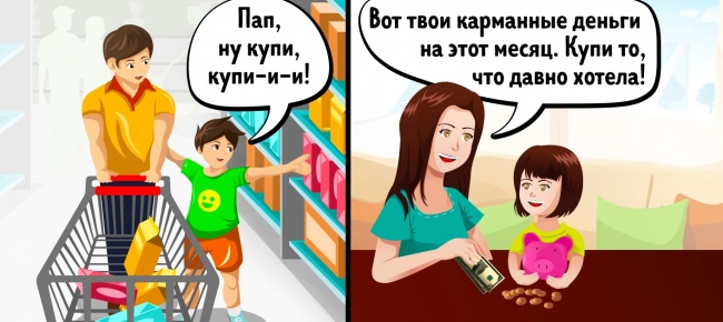 При поході до супермаркету діти зазвичай не влаштовують істерик з приводу «смачненького», які батьки відмовилися їм купити. Так як всі «экстрасладости» або іграшки можна купити за кишенькові гроші. Перші кишенькові гроші діти починають отримувати у віці 7 років. Зазвичай їх місячний розмір дорівнює віком дитини.