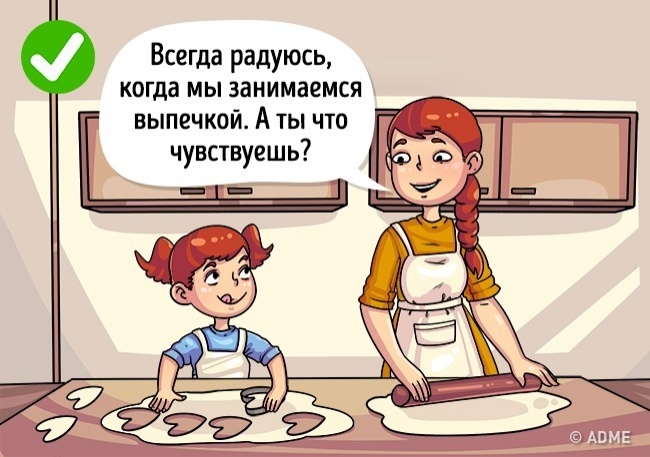«Що ти зараз відчуваєш?», «Як пройшов твій день?» — такі питання, по-перше, сприяють емоційної близькості між батьком і дитиною. По-друге, формують його здатність формулювати свої думки. Але, головне, дозволяють дитині бути досить чуйним і уважним по відношенню до самого себе.