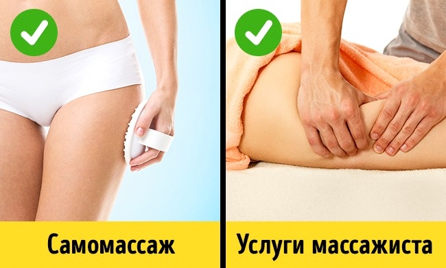- У профільних салонах і клініках масаж робиться пристосуваннями, які руйнують накопичені шари підшкірного жиру і покращують обмін речовин.