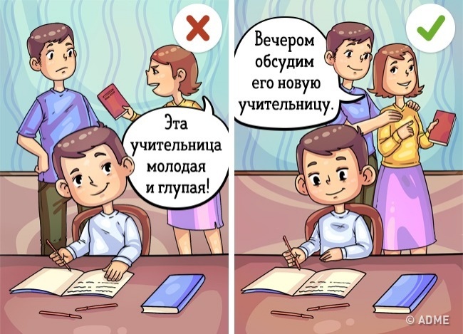 Критикувати інших людей в присутності дитини — не кращий варіант, особливо якщо той частенько знаходиться в їх суспільстві. Прибережіть цю тему для розмови з чоловіком (дружиною) наодинці.